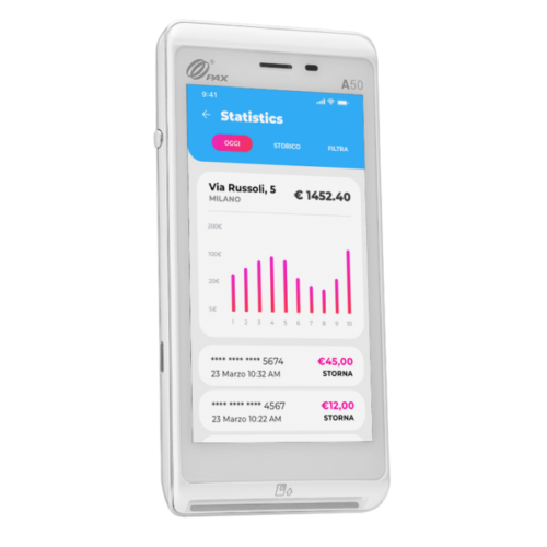 Fatti pagare al momento della consegna o alla fine del servizio con PAX A50, lo smartphone di pagamento semplice e compatto.